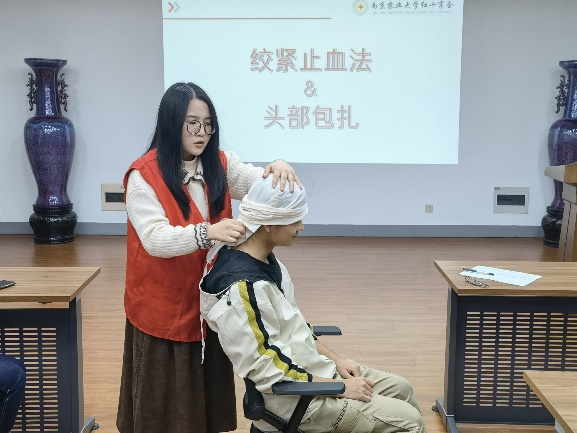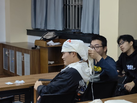 之后,宣讲员为大家讲解紧急包扎的适用情况和相应的采取措施。接着,简明扼要地介绍了紧急包扎的基本流程以及每一步操作的重点。最后,在宣讲员的操作示范后,同学们拿到了三角巾并开始检验自己的学习成果。在实践过程中,不断涌现出一批批外貌形象出众的“伤员”,宣讲员们笑着指导着一个又一个的经典“错误”,表扬着一个又一个的标准模范,就这样在一片欢声笑语中让同学们掌握了紧急包扎的“精髓”。
