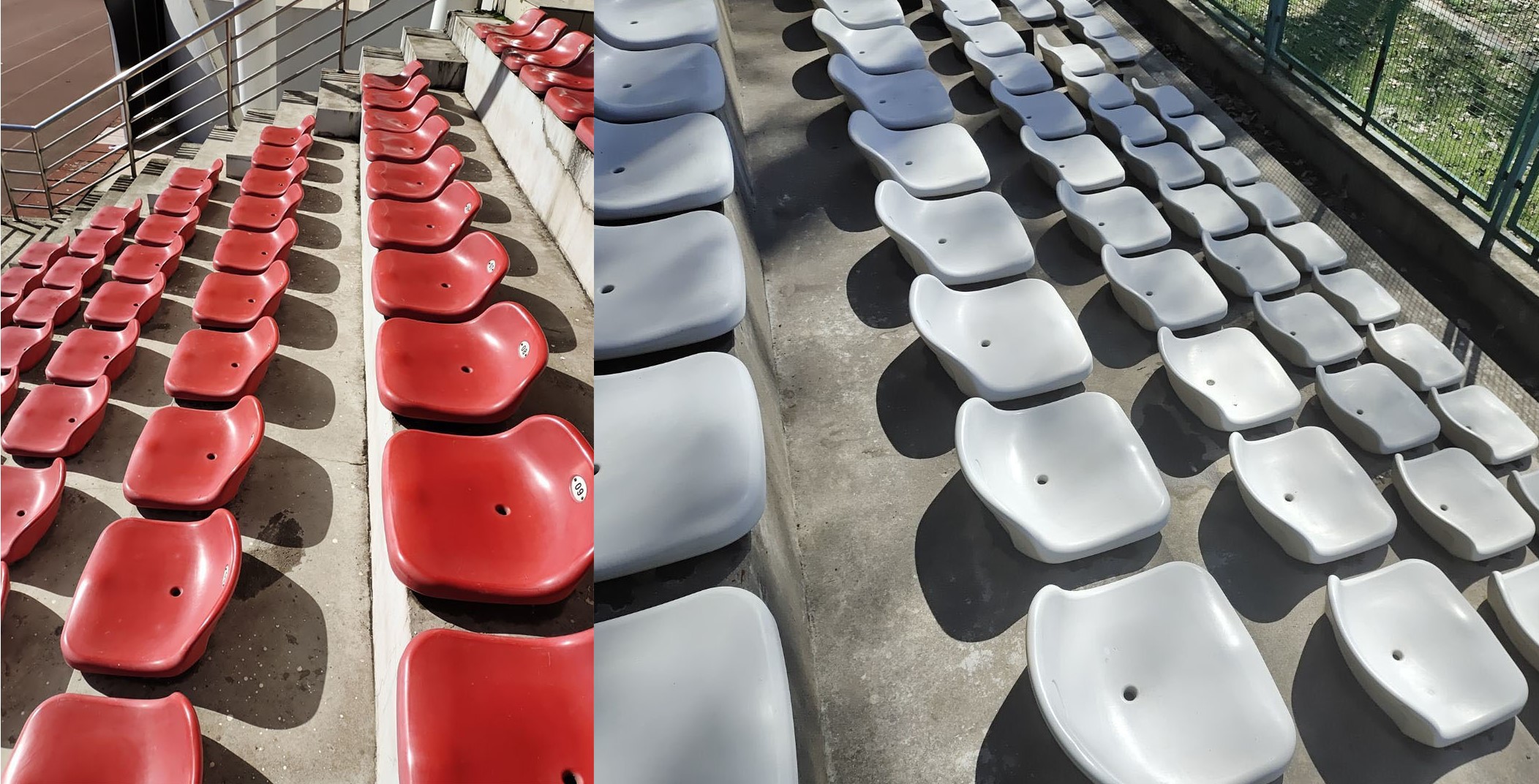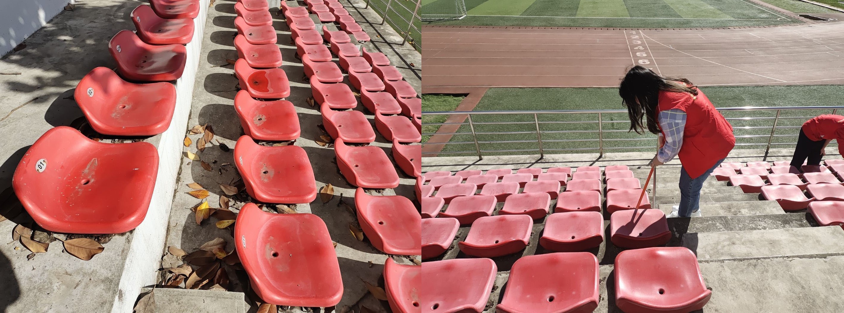 经过两个小时的打扫,主席台两侧及靠近玉兰路一侧的观众席,全部被清洁完毕,焕然一新,鲜亮的红色无疑是今日校园里独特的风采。