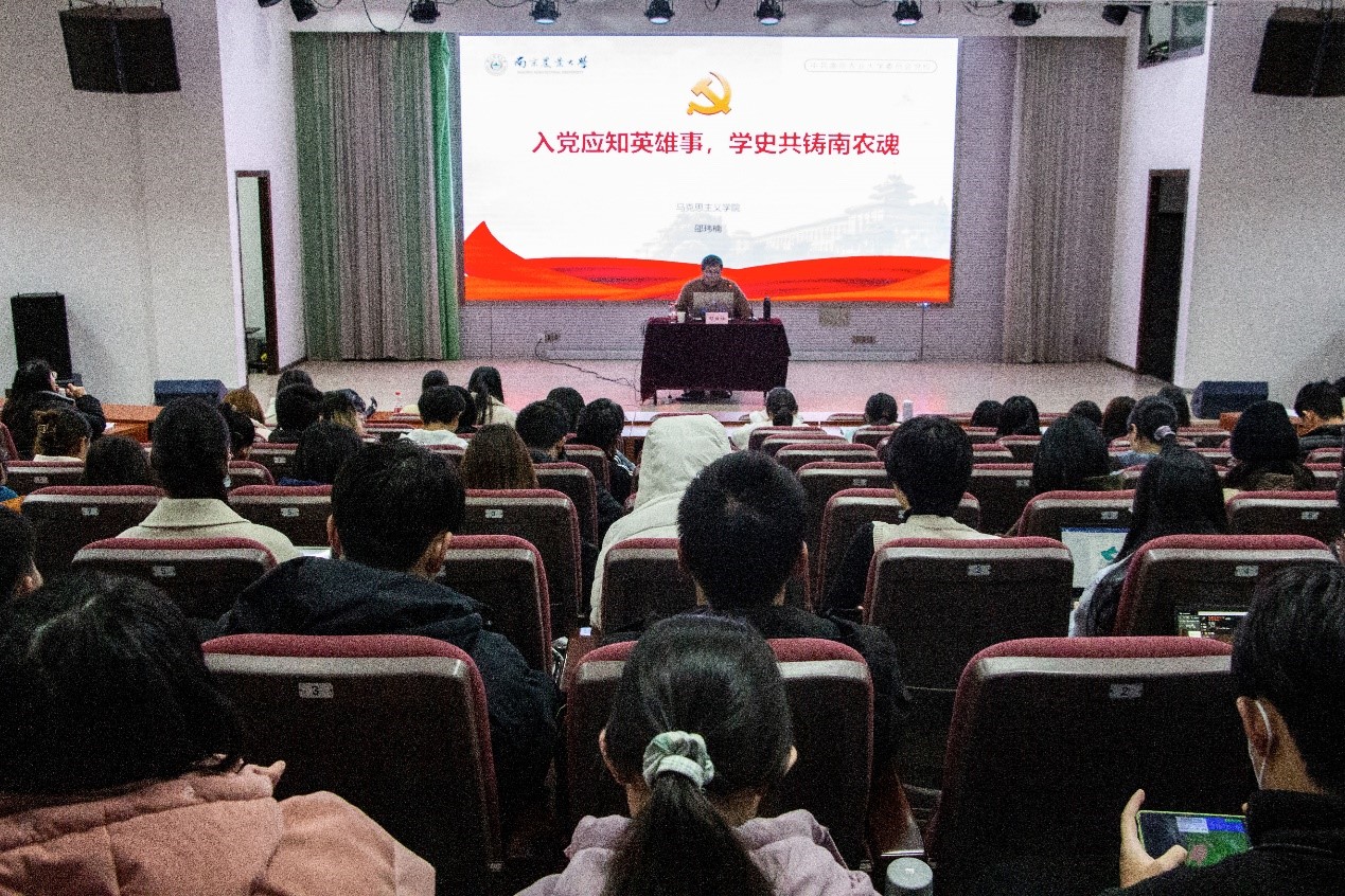 12月15日下午, 厂长资源 在教四楼报告厅举办专题教育党课。马克思主义学院教师邵玮楠作题为“入党应知英雄事,学史共铸南农魂”的专题报告。 厂长资源 辅导员、分党校学员代表参加了此次党课。