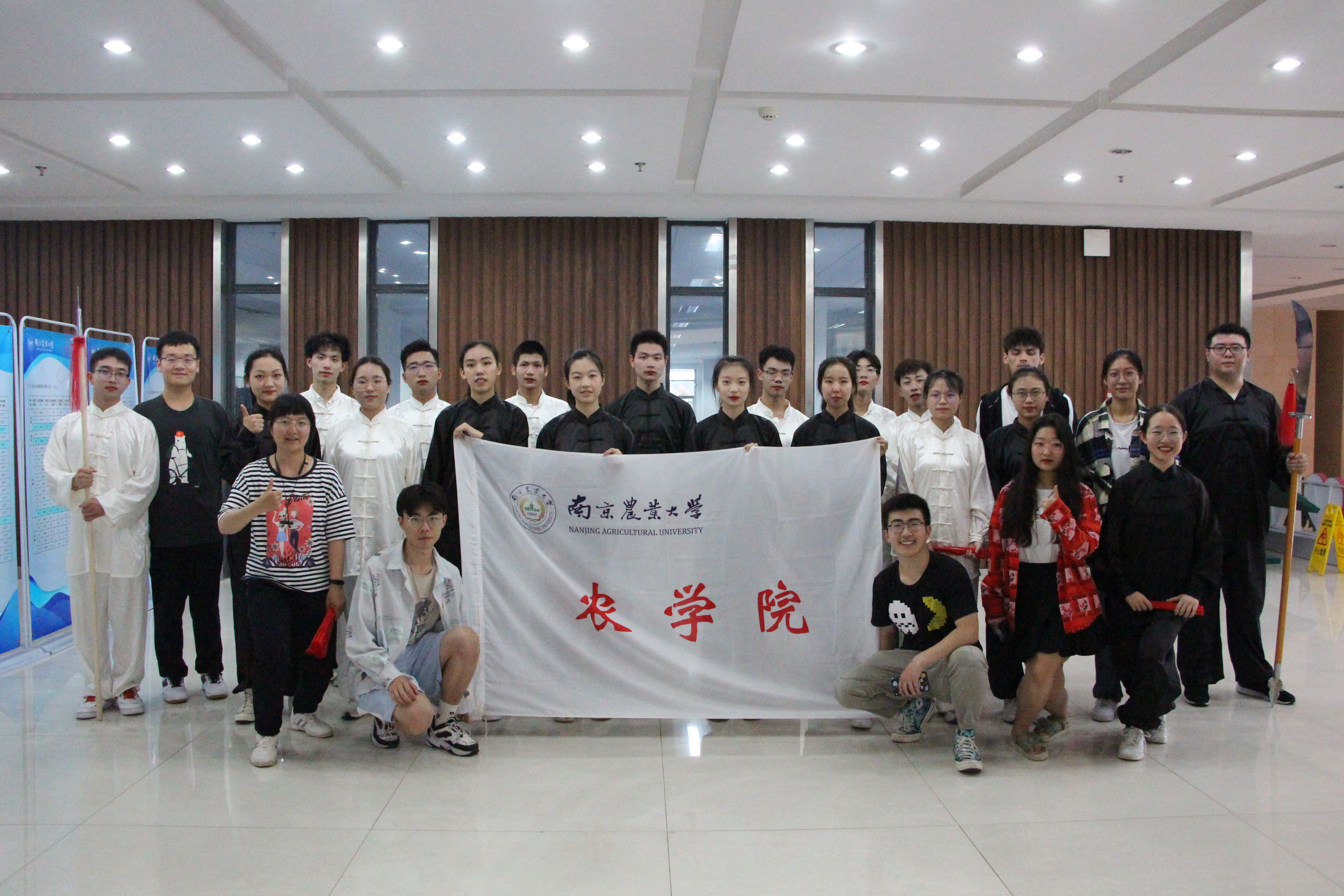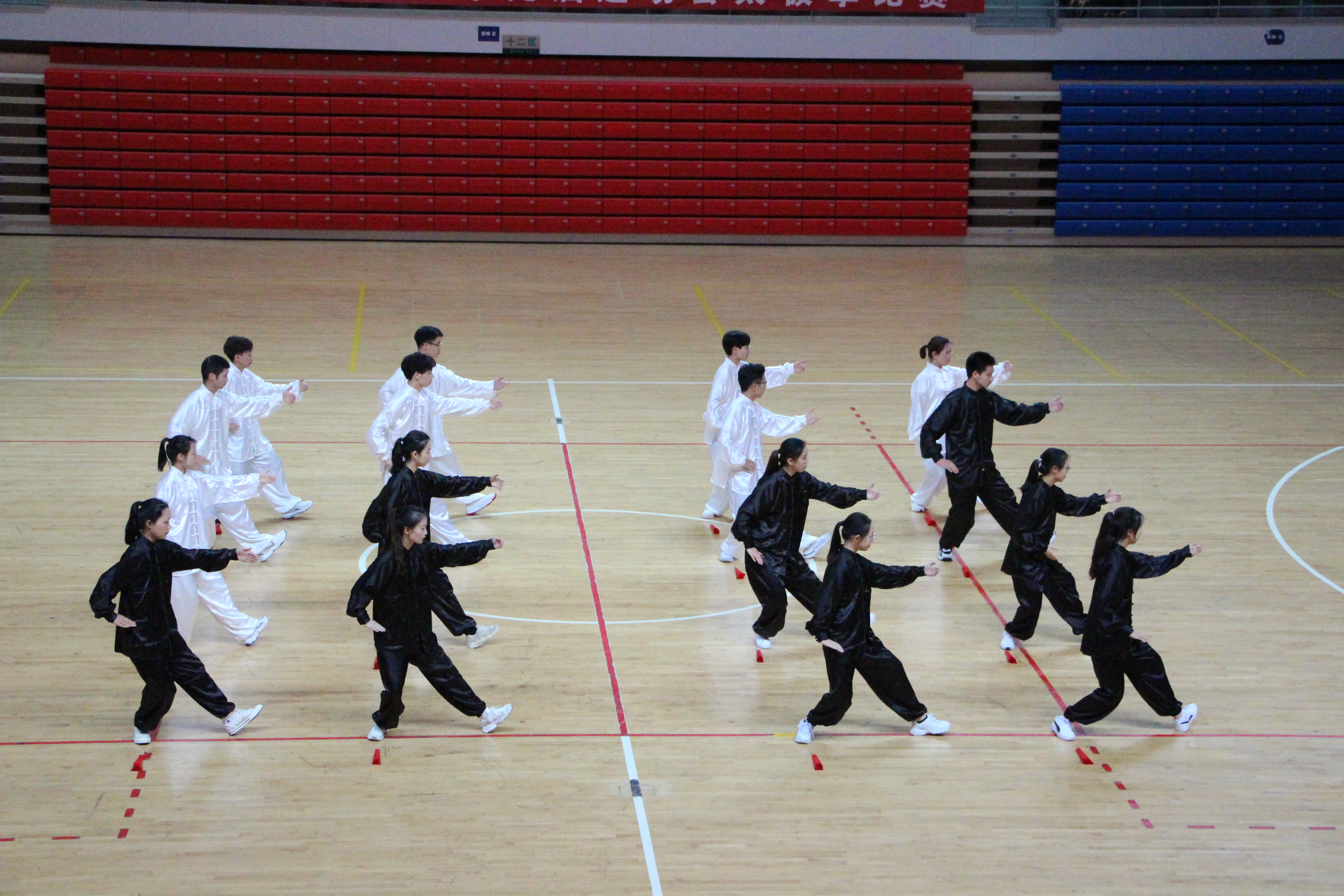 中午12:00,参赛队员们在生科楼E1001做好比赛前的准备工作,换衣化妆,调整好状态。13:30,全部人员前往体育馆进行赛前准备。我们院作为第二个比赛的院系,同学们整装待发,提前在场地候场,主持人宣布入场之后, 厂长资源 太极拳代表队动作整齐,口号洪亮地进入主场地。随着音乐的响起,参赛选手迈开左腿,起势,连贯而不失节奏地开始表演,全身柔绵而有力,每一个关节灵巧的配合,身心倾听着悠扬的乐曲,双手如同白云一般舞动着,在柔和的动作中也藏着几分刚劲,双手握拳,转腿,向前缓缓推掌,太极拳部分队员们动作流畅、整齐。随着音乐的转变,表演转入武术部分。同学们精神抖擞,动作苍劲有力,疾若闪电,又稳健又潇洒!引起场内的一阵欢。最后是太极扇部分,同学们开扇合扇整齐划一,给全场带来了一场视觉盛宴。整体比赛从入场到离场,队员们态度认真,表情管理到位,展现了我们 厂长资源 的风采!