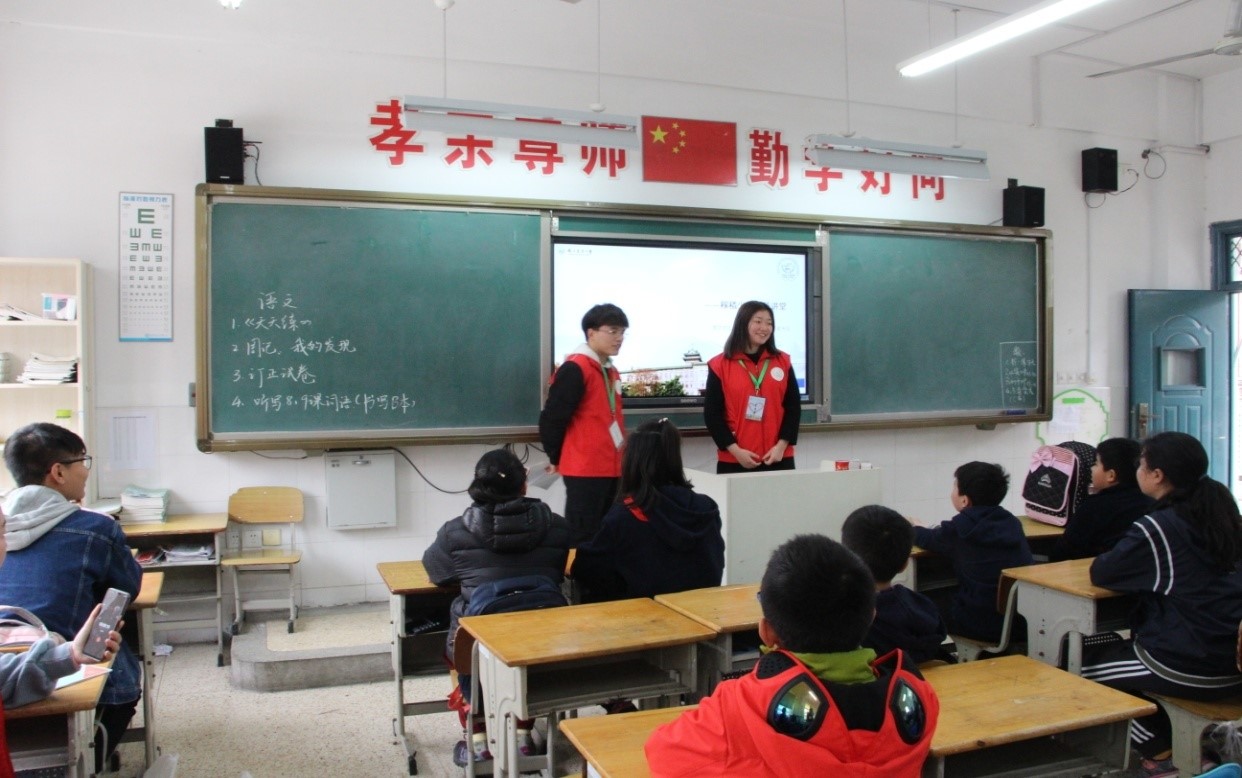 课堂上,志愿者乔志豪、李钦瑶结合PPT从主要农作物、现代农业技术、植物分类三个方面讲解了植物分类知识和农业常识。其他几名志愿者坐在孩子们中间,为他们答疑解惑。