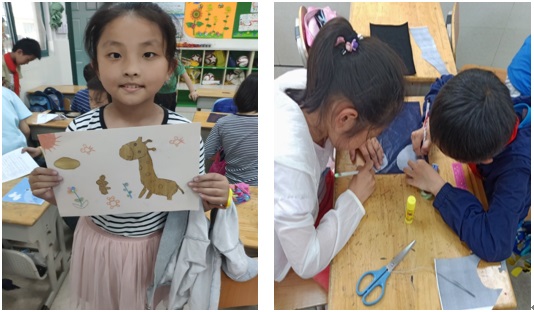 随后,9名志愿者分别来到5个班上,指导同学们以4人为一组完成了精美的麦秆画作品。通过小组协作,学生们在亲手接触麦秆、近距离观察农作物的同时,增加对农业的真实感触和好奇心,培养动手操作、团队协作的能力。