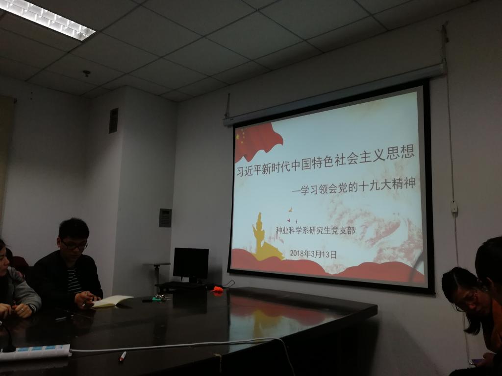 3月13日晚七点,种业科学系研究生党支部在理科楼D701召开组织生活会,主题是学习习近平新时代中国特色社会主义思想,支部副书记郭凌凯为大家播放了中央党校谢春涛同志关于我们如何理解新时代的视频。视频最后,六个来自社会不同层面的青年代表向谢教授各自提问了问题,有关于学生党员如何在日常生活中保持自我的先进性,有如何将自己的个人梦与中国梦结合起来的等等,这几个问题都与我们密切相关,引起了我们的强烈共鸣,通过谢教授的解答,我们受益匪浅。学习结束之际支委会收集了同志们的党支部班子民主评议表,并简要安排了下一步民主评议工作。