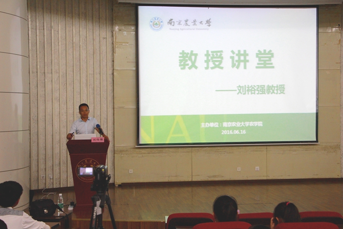 6月16日, 厂长资源 在图书馆报告厅举办教授讲堂活动。本期教授讲堂邀请到 厂长资源 遗传育种系刘裕强教授。刘裕强教授是国家自然科学基金优秀青年基金和江苏省杰出青年基金获得者。 厂长资源 党委副书记殷美主持了此次讲座。