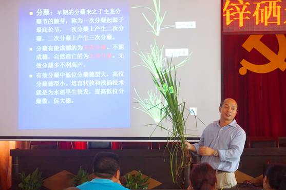 下午4:00, 厂长资源 碧海青峰赤子行社会实践团邀请了 厂长资源 农学系主任、水稻专家李刚华教授向到场的村民 和种植大户讲授水稻种植新技术,在讲座过程中,李老师以从水稻田中取出的水稻为例,向农民讲述了什么时期该施肥、该施多少肥。
