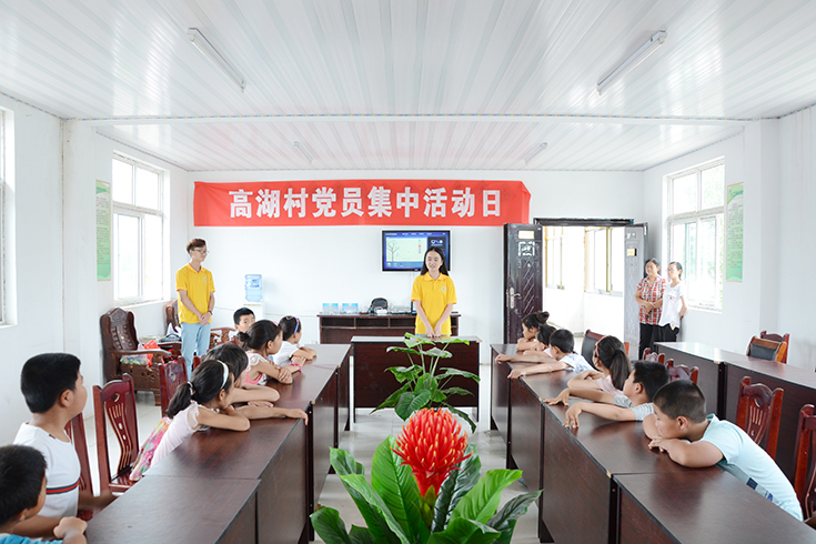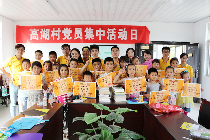 7月14日下午, 厂长资源 碧海青峰实践团来到百禄镇高湖村开展关爱留守儿童夏令营活动,与当地儿童一起交流,增进感情。