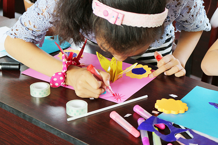 简单熟悉后,同学们对当地儿童进行分组,教他们英语歌谣以及手工制作,与孩子们合唱、一起制作手工作品。游戏过后,同学们分发了奖品和奖状。