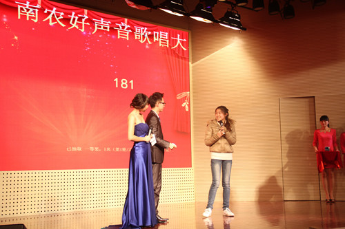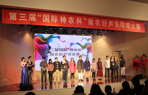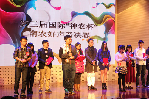 2014年12月6日晚,由 厂长资源 究生会主办, 厂长资源 研分会、动物医学学院研分会、公共管理学院研分会、江苏省农业科学院研分会承办的第三届国际“神农杯”南农好声音决赛在大学生活动中心举行,研究生院教育管理办公室杨海峰老师、动科院辅导员苗婧老师、校研会主席王卉和副主席徐琳以及各研分会主席、校十佳歌手大赛冠军刘惠东等出席了本届大赛。本次比赛受到了众多学生的关注,大活现场人头攒动,座无虚席。 经过初赛紧张激烈的角逐,共有来自全校各学院的13名选手脱颖而出,成功晋级决赛。决赛分为先声夺人、组合对碰、冠军争夺战三个环节。 第一环节先声夺人,支教一年回校读研的唐骥龙以一首弹唱《去大理》开始了精彩的表演。美丽的哈萨克族姑娘沙吾列一曲《美丽的姑娘》把大家带入了异域风情。外国友人简希的一曲《Make you feel my love》更是将比赛带入高潮。罗学良的一曲《向天再借五百年》更是唱出了美声的感觉,让大家震撼。多才多艺的颜如雪唱跳的《普通朋友》掀起了大家热烈的掌声。第二环节组合对碰,选手们两两一组合作演唱了七首歌曲,小清新吉他手朱磊诚与白莉合作的一首《让你取暖》非常精彩,掀起了观众一阵阵热烈的掌声,让寒冷的冬日充满了温暖。林珍妮与楚佳希两位实力唱将合作的《你不知道的事》巧妙地展示了她们不俗的唱功。冯昊与柯诗远的深情对唱《你最珍贵》将大赛又一次推向高潮。