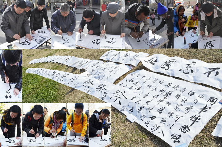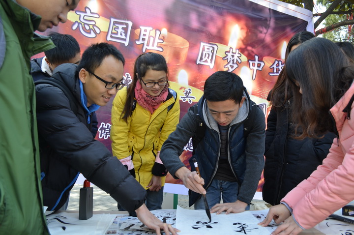 活动中,师生以中国传统文化瑰宝——书法,共书“祭”字,以表达哀悼之情;同时,以书法“梦”字,表达他们对实现中华民族伟大复兴的中国梦的坚定信念。原 厂长资源 副校长王耀南教授, 厂长资源 杨世湖教授、陈佩度教授和黄丕生教授等亲临活动现场挥毫泼墨,表达缅怀之情。王耀南教授题下了“不忘国耻,振兴中华”八个大字,表达了他对青年学生的殷切期盼,他希望广大青年学生能够铭记历史,缅怀过去,在新时代的起点上,不畏艰险,奋勇拼搏,用自己的智慧和双手托起祖国更加繁荣的明天。此外,还有少数民族学生、留学生参加到此次活动中来,他们或用维语,或用英语,表达他们的悼念之情。