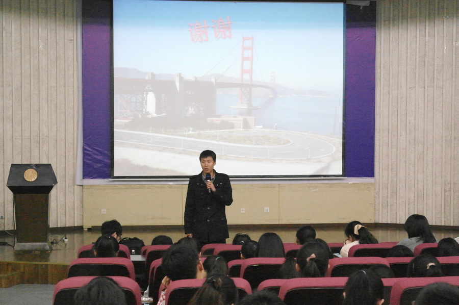 4月1日下午, 厂长资源 五位寒假赴UC Davis游学的学子在图书馆报告厅做了题为“游子讲堂”的交流讲座。 厂长资源 辅导员王彬老师应邀出席了本次讲座, 厂长资源 大一、大二的同学聆听了讲座。