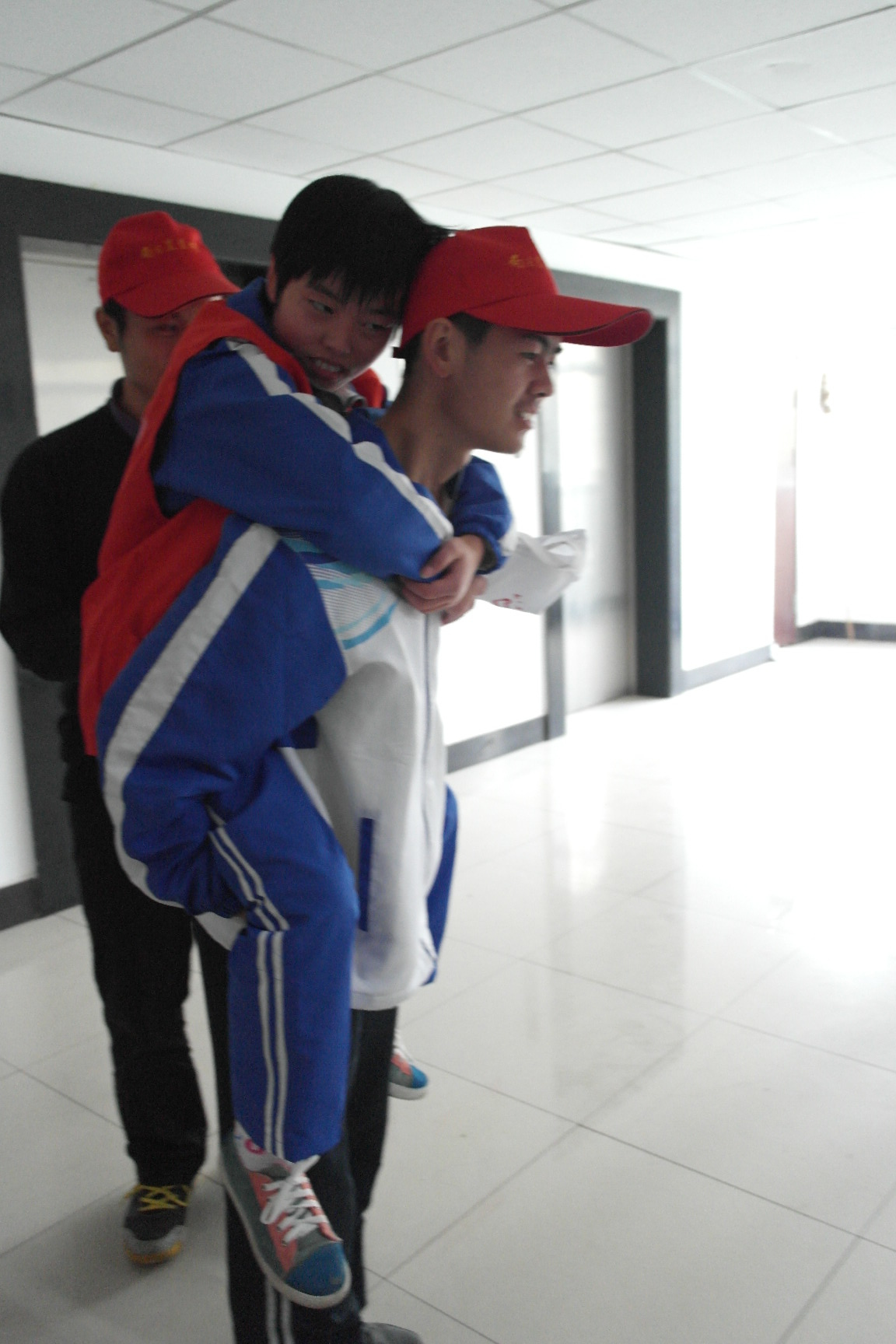 下午3:00,所有参与演习的学生以及工作人员在各自所属的位置上待命,随着闪着警灯的消防车从玉兰路驶向19舍,演习拉开了序幕。“火情出现!”19舍8楼的窗户冒出了红色烟雾,一名女同学在冒出烟雾的窗口捂住口鼻呼救挣扎着。这时,火情侦察员拨打了“119”火警电话,并拉响了警报,随后学校保卫处与校医院的工作人员赶到现场。紧接着,消防官兵从消防车工具箱内取出担架,带领负责救援的同学,换上隔热服,冲进19舍,进行灭火搜救。几分钟后,楼门口就有大批学生经楼梯跑出宿舍楼,用毛巾捂住口鼻,成功疏散。随后,两名身穿隔热服的消防队员把一位“受伤”的同学用担架抬出,并配合校医院的医护人员进行“紧急治疗”。在撤离结束、伤员清点之后,演习圆满结束。