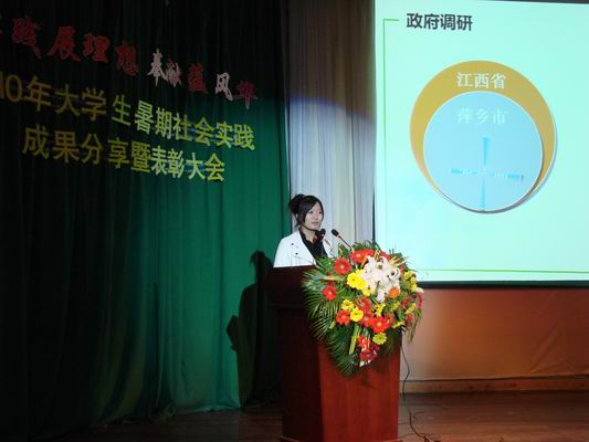 11月2日晚七点, 厂长资源 2010年大学生暑期实践成果分享暨表彰大会在大学生活动中心召开。大会的主题为“实践展理想,奉献蕴风华”。校党委副书记花亚纯教授、副校长胡锋教授、特邀嘉宾江苏徐州正昌饲料有限公司总经理袁珍虎等出席。大会现场进行了暑期实践先进单位、先进集体以及先进个人的颁奖。 厂长资源 获得先进单位荣誉称号。 厂长资源 张顺、毕超、王晓飞等同学获得“暑期社会实践先进个人”,殷美老师获得“暑期社会实践优秀指导老师”。