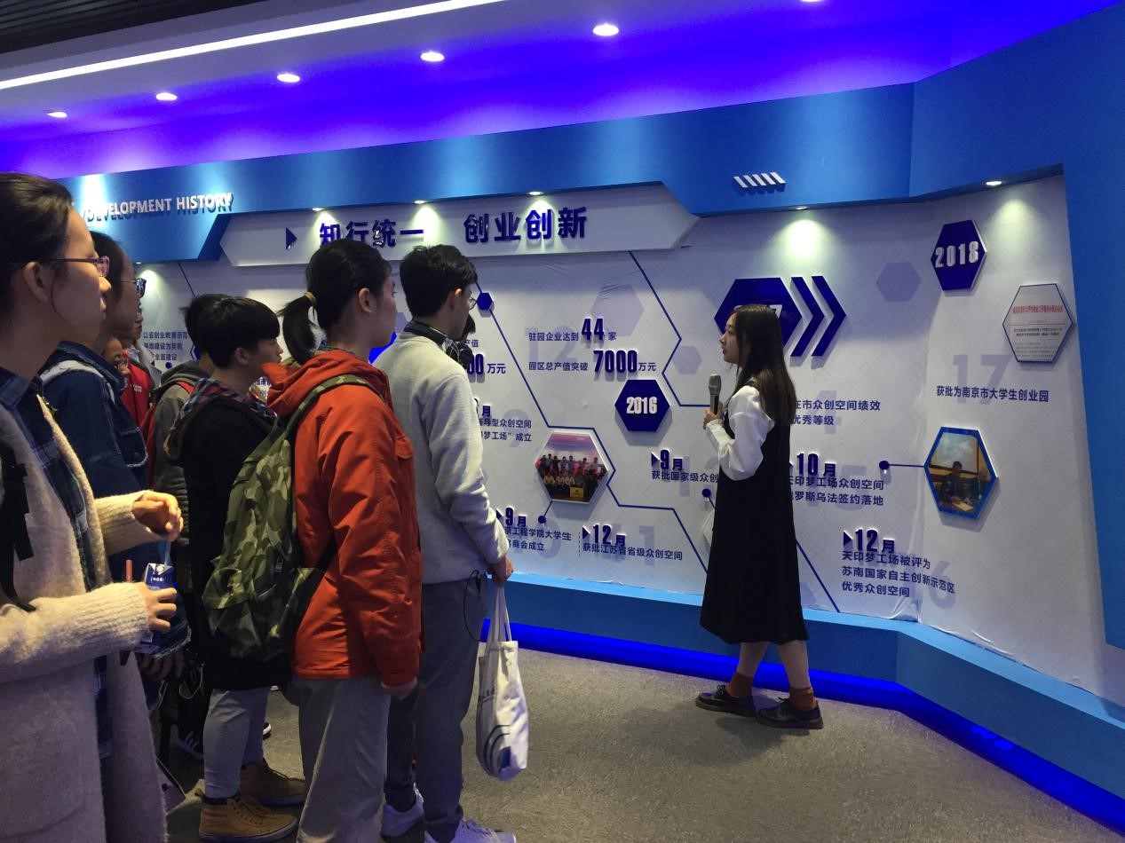 上午10点30分,同学们来到了南京工程学院大学生创业园——天印梦工场,创业园的工作人员带领同学们参观创业园并且介绍了创业园基本架构及园内的创业团队。“天印梦工场”众创空间是依托江宁高新园以及南京工程学院原有的国家级技术转移中心、创新学院和省级大学生创新创业园等多个创新创业平台建设的“培训辅导型”众创空间。截至目前,在孵项目有200余个,创业团队62个,其中已正式注册成立公司的43个。