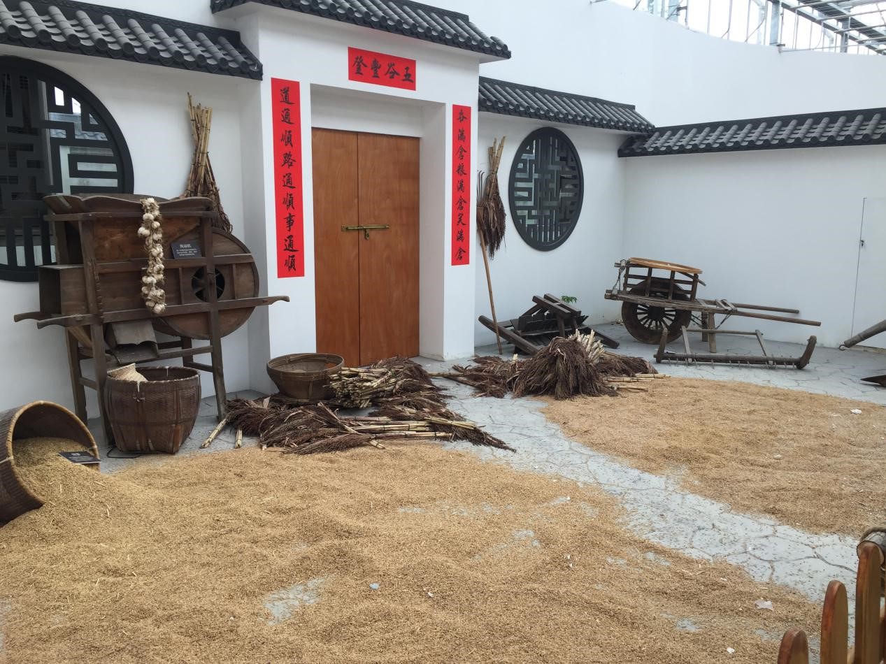 用谷物及农具装饰的农家小院体现丰收的场景。