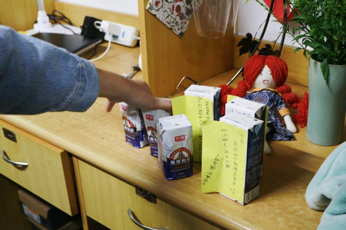 “天道酬勤,何事难为”“祝学姐考上理想院校”……牛奶盒上贴着学弟学妹们激励祝福的话语,考研的同学们也表示他们感受到了学院和学弟学妹们的关心,看到学弟学妹们的祝福,考研更加有动力了。