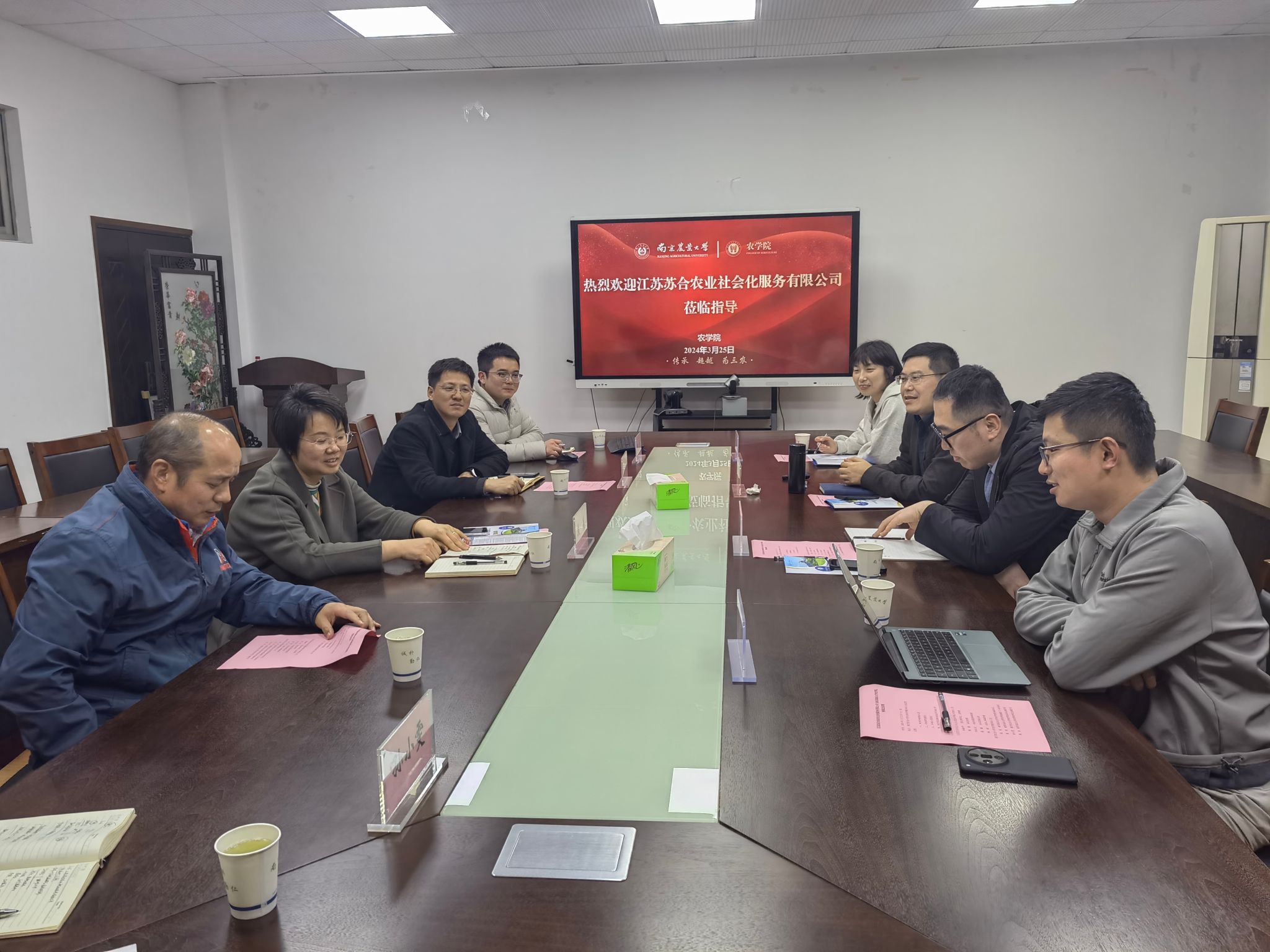 3月25日,江苏苏合农业社会化服务有限公司党支部书记、总经理孙振中一行来 厂长资源 交流座谈, 厂长资源 党委副书记殷美、副院长李刚华,农学系教授蔡剑,辅导员孙小雯、陈杰参加座谈会。