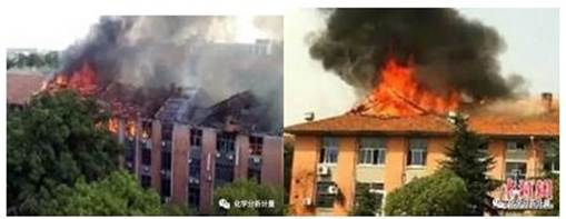 2012年6月3日上午7点半左右,北京大学一实验楼突然起火,消防员及时赶到将火扑灭。所幸楼内没有人员,初步怀疑火灾是电线老化引燃木条所致。(下图左)